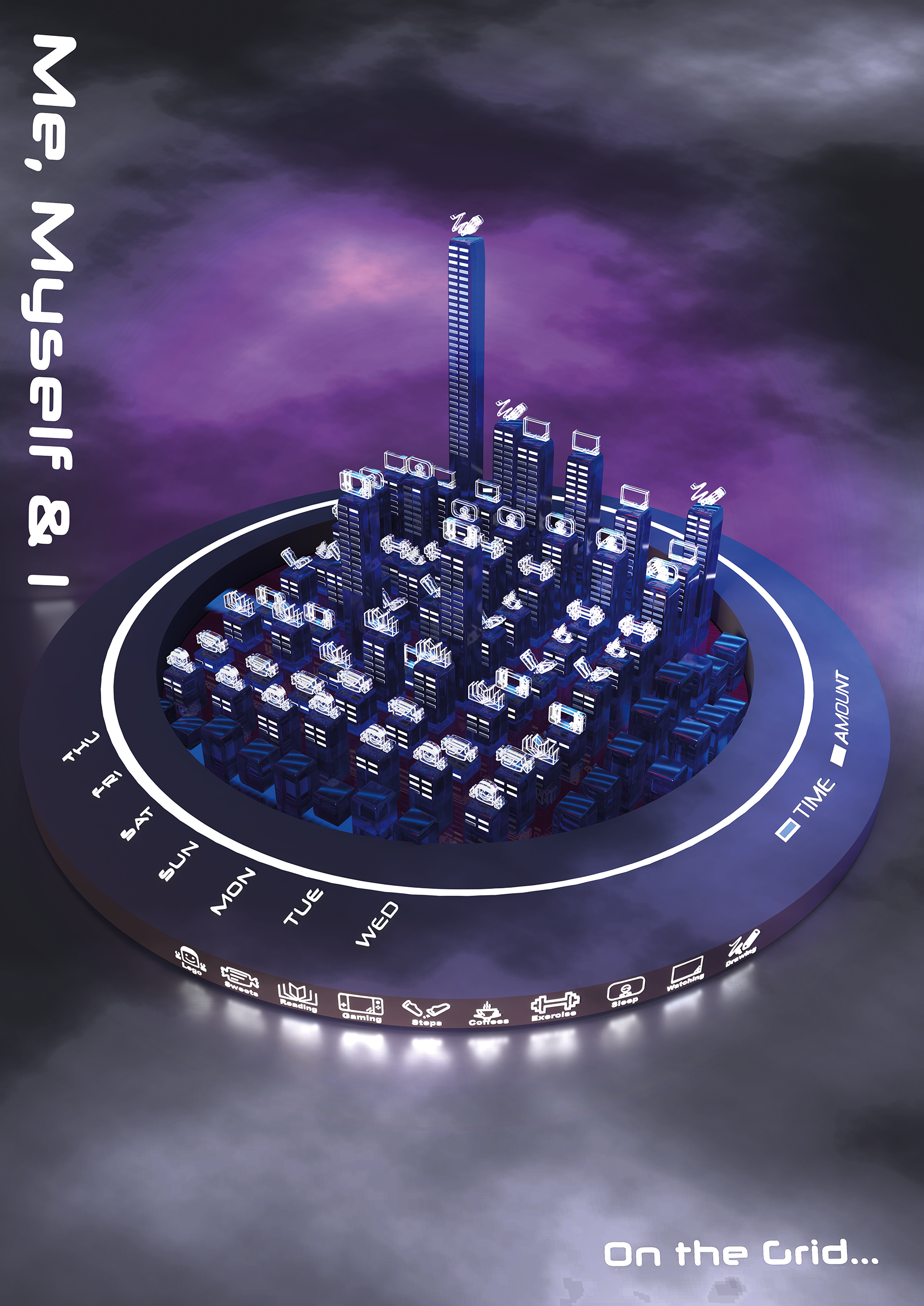 The subject of this brief was to be data regarding ten individual activities, based on me, recorded over a week and then used to create a design that incorporates iconography to convey the information graphically. The look and feel were to reflect me metaphorically and so the poster was made to look like a city from the movie Tron... sometimes it feels like we are all living in a simulation. This was pure Design Process.